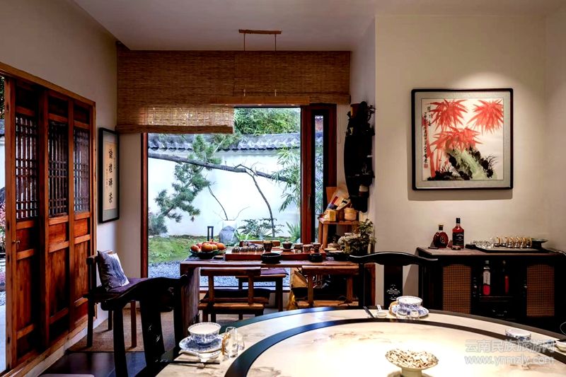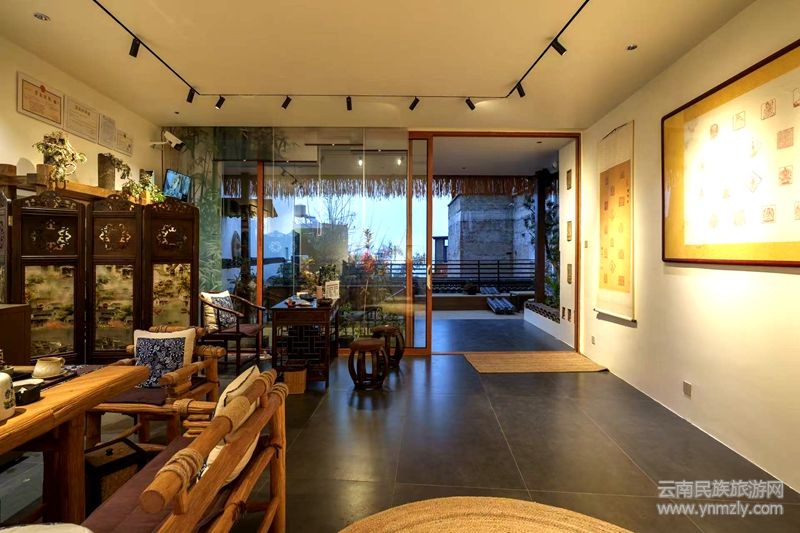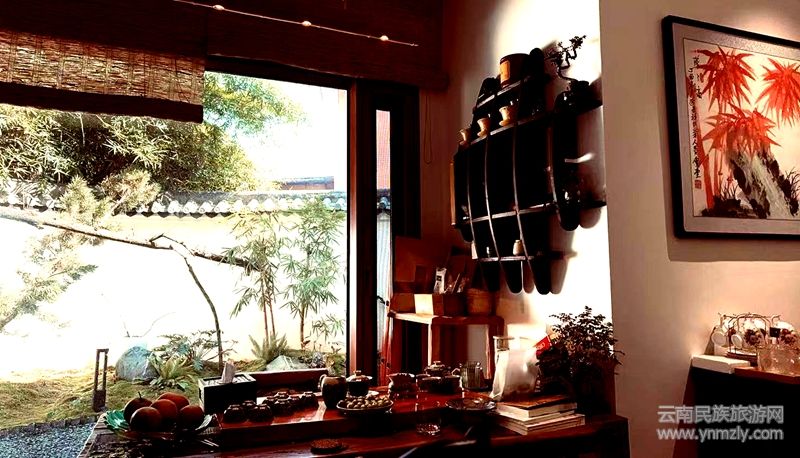 走進小院子,更是處處是風景,青松、翠竹、玉蘭花開、小鳥歌唱、松鼠打架、秦式茶臺;從樓上往下看又是一番別樣的風景,從屋頂眺望滇池,水天一色,盡收眼底。走廊上,唐三彩、宋窯瓷器,熠熠生輝,仿佛在講述著唐朝盛典和宋代輝煌的故事;客房中,衣架設計成小提琴;茶具古色古香,招人喜愛;名人字畫及中國篆刻大師耿云明的作品隨處可見、相映成趣;塤音裊裊,禪意無限,誦讀著殷商文化的前世今生。