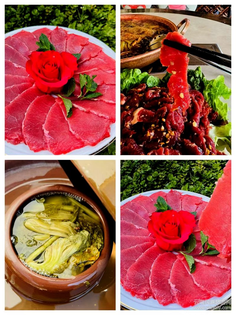 菜單上的菜品琳瑯滿目,每一道都讓人垂涎欲滴。招牌的“酸菜土黃牛肉火鍋”,選用深山里放養(yǎng)了5年以上的土黃牛,搭配上祖?zhèn)髅刂频乃岵?。鍋中燉煮的牛肉,肉質(zhì)鮮嫩多汁,每一口都飽含著濃郁的肉香和酸菜的獨(dú)特韻味,燉煮的火候恰到好處,牛肉既保持了嚼勁又入口即化。湯底色澤誘人,酸菜的脆爽與牛肉的醇厚完美融合,形成了一種獨(dú)特而和諧的風(fēng)味!