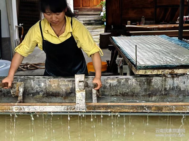 (7)漂構(gòu)皮。將蒸熟的構(gòu)皮放入流淌的清水中,用腳反復(fù)踏揉漂洗。漂凈構(gòu)皮上的石灰水,再搬到用鵝卵石鋪底鑲邊的池塘中,利用地下冒出來(lái)的清泉水浸泡2天。泡池深到膝處,便于浸泡、洗滌。