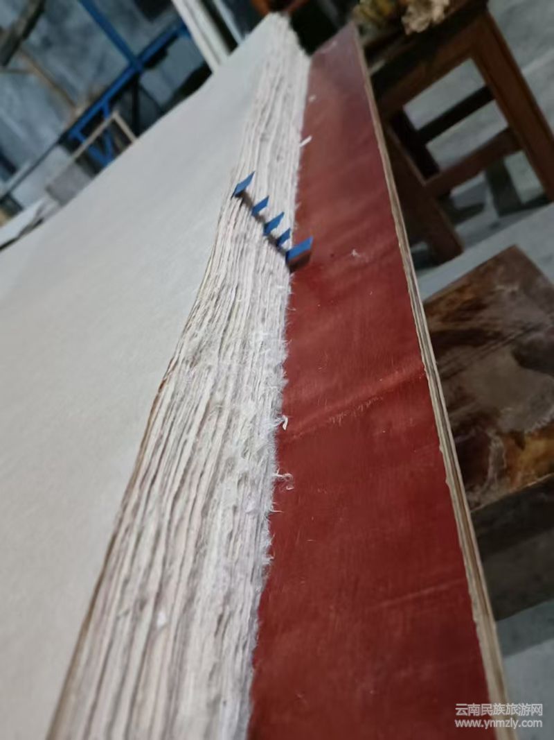 (14)背紙。將榨干水份后的紙膜一張張揭起,依次貼到背板上或墻上曬干,疊間寸許,每一張紙都要用刷子自上而下的刷均勻。兩張紙背在一起就是雙合紙。