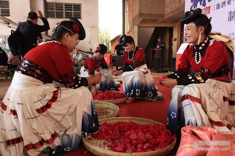 隨后,眾人前往大竹園酒廠,見證非遺釀酒技藝的核心環(huán)節(jié)。三迤酒業(yè)董事長、市級非遺代表性傳承人陶俊勇宣布制鹵啟動儀式正式開始,并在致辭中分享玫瑰老鹵酒的傳承歷程:“我們堅持選用松華壩水源保護(hù)區(qū)的龍?zhí)端劸疲@里的水質(zhì)清冽甘甜,富含多種礦物質(zhì),與高原玫瑰、紅纓子高粱巧妙融合,造就了玫瑰老鹵酒入口綿柔、飲后回甘的卓越品質(zhì)。” 活動現(xiàn)場,苗族姑娘進(jìn)行手工分揀及花瓣分離展演,將分離的花瓣作為首缸原料;陶俊勇先生與黃老師共同完成鮮花入缸,并進(jìn)行首次打耙,古樸的釀酒儀式讓在場所有人感受到非遺技藝的莊重與傳承的力量。此外,云南國際商會的授牌儀式,更是對三迤酒業(yè)傳承與創(chuàng)新的高度認(rèn)可。