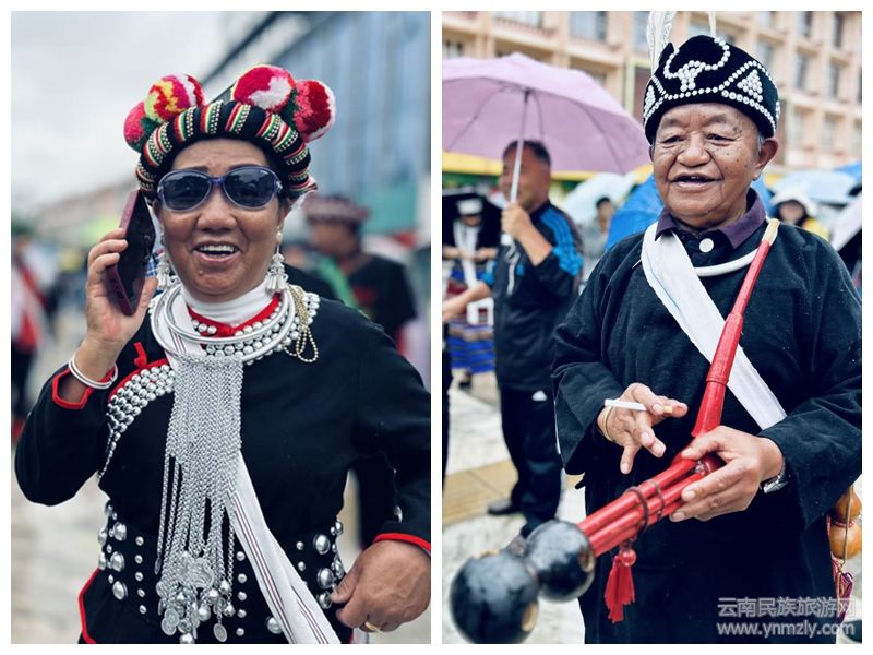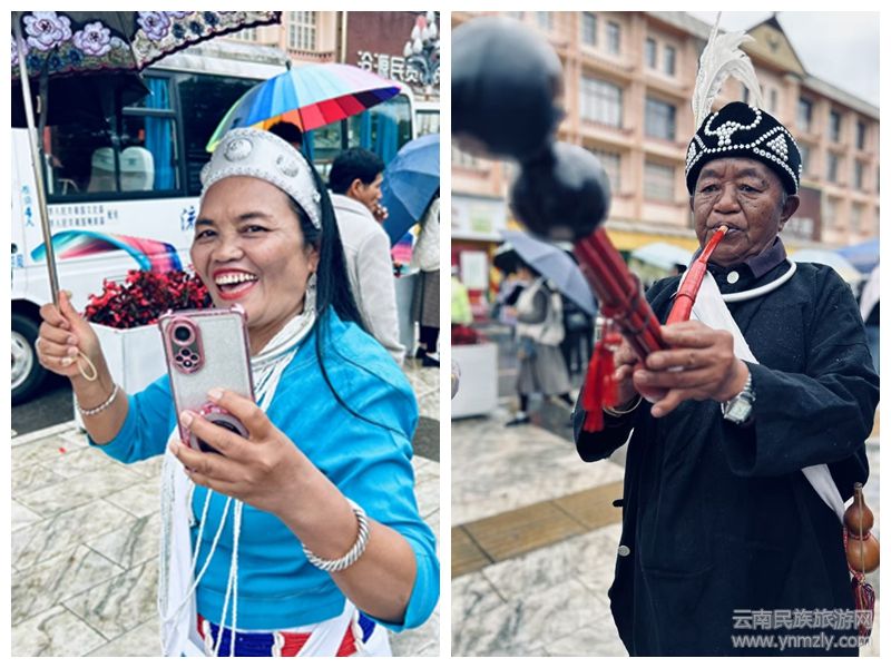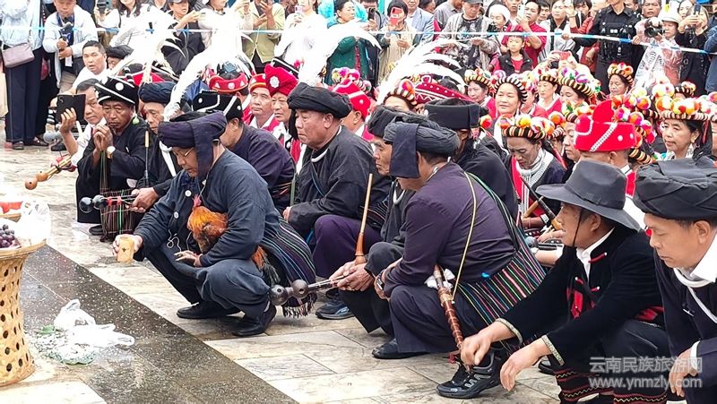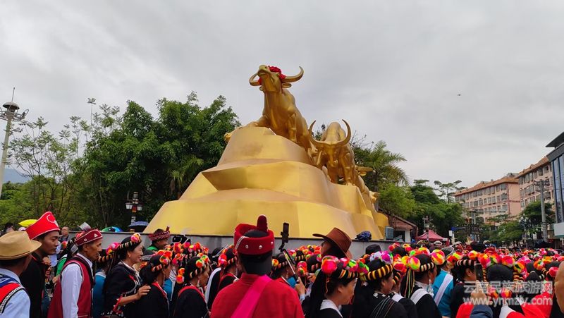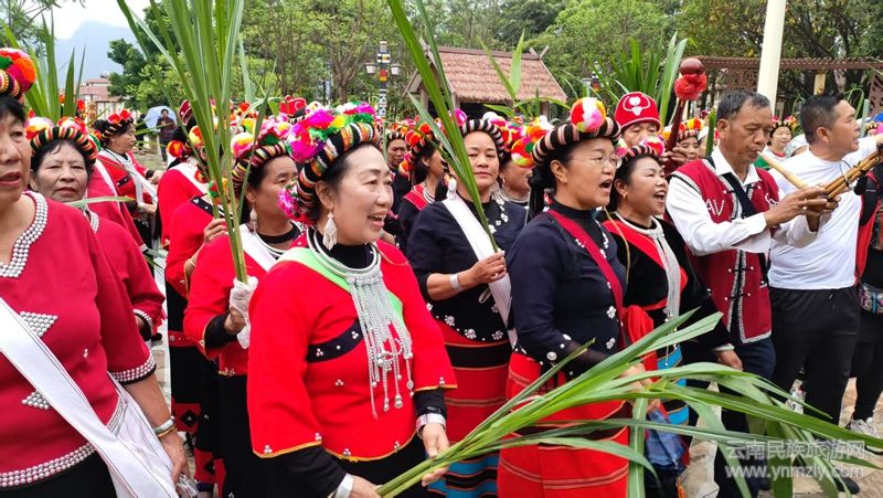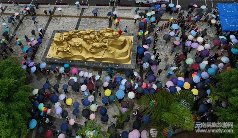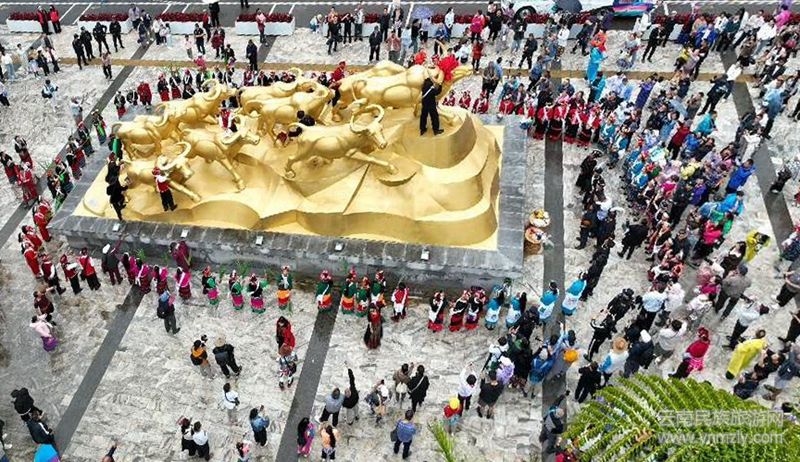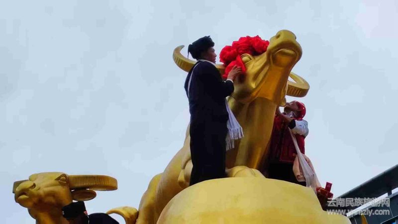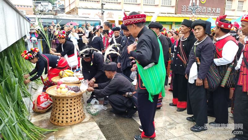 儀式現(xiàn)場,九頭牛雕塑前擺放著糯米粑粑、芭蕉、茶葉、糯米飯、米花、水果等。隨著主持人宣布儀式開始,百名佤族老人緩緩入場,洗牛頭、系紅布、戴紅花,游客們在祈福聲、蘆笙聲、傳統(tǒng)打歌調(diào)聲中體驗(yàn)了一場別具佤族風(fēng)情的民俗活動(dòng)。