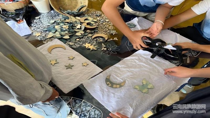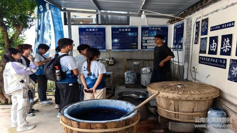 第六站,支教團(tuán)走進(jìn)染香院,沉浸式學(xué)習(xí)白族扎染。在傳承人講解下,了解白族扎染技藝的歷史淵源、文化寓意與工藝智慧。在近距離觀賞精美扎染成品后,成員們在指導(dǎo)下嘗試扎結(jié)、捆綁、浸染。當(dāng)親手構(gòu)思的藍(lán)白圖案最終顯現(xiàn),成就感與敬意在成員們心中油然而生。這一過程不僅是技藝學(xué)習(xí),更是在藍(lán)白染韻的奇妙交織中,完成了一次對專注、創(chuàng)新與傳承責(zé)任的淳樸匠心。