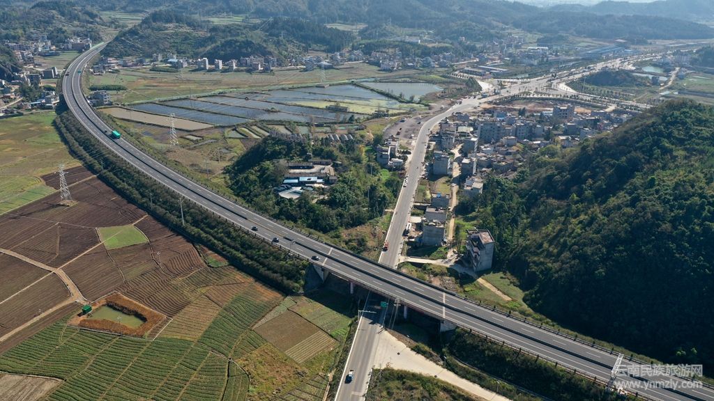 改革春風(fēng)振九垓,石安路破紅土嶂。昆嵩高速穿爨鄉(xiāng),萬(wàn)里直道刻古梁。卅萬(wàn)玉帶纏峰壑,千條金線(xiàn)戍邊墻。橋隧穿云接霄漢,阡陌織網(wǎng)煥新妝。物流恰似盤(pán)江涌,旅跡猶如星斗鑲。秘境從此無(wú)僻壤,偏鄉(xiāng)瞬息達(dá)洲洋。