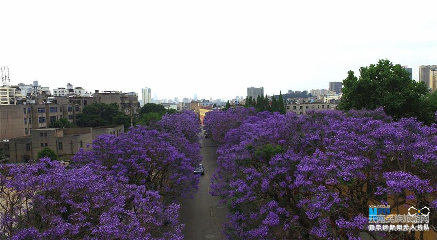 航拍昆明藍(lán)花楹大道 “藍(lán)色花海”惹人醉